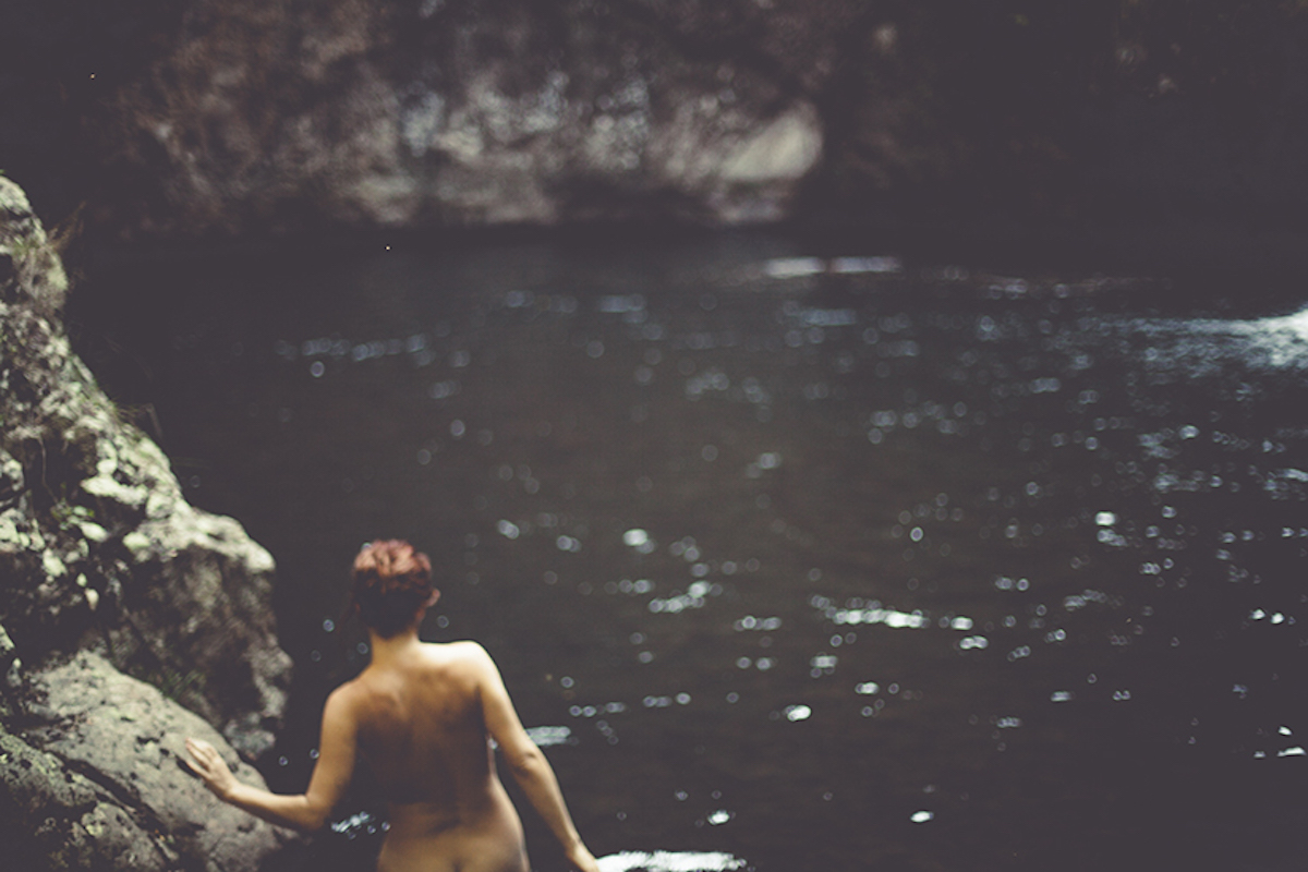 Irgendwann sieht sie sich aufmerksam um, atmet ein, atmet aus. Dann zieht sie sich aus, legt ihre Kleider auf einen Stein am Ufer und geht vorsichtig ins Wasser, nackt und ein wenig zitternd. Es ist kalt, das Wasser, eisig kalt, doch sie lässt sich nicht beirren. Etwa in der Mitte kniet sie sich hin, dann setzt sie sich auf den steinigen Grund. Das Wasser reicht ihr bis zu den Schultern. Sie lässt ihren Blick wandern, lässt ihn über die kleinen Wellen stolpern und immer wieder hinauf zu den Baumspitzen klettern.