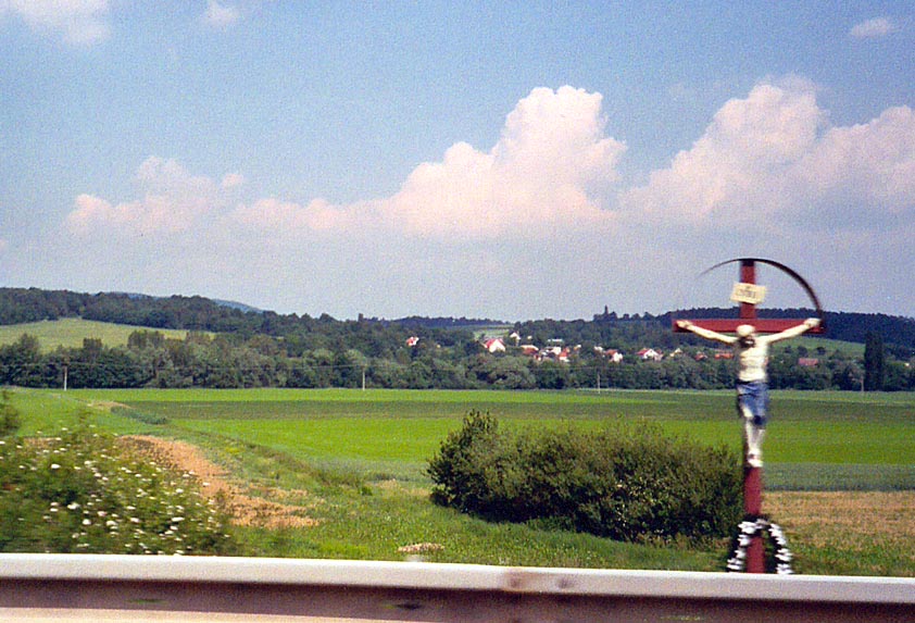 Der Mann hängt an seinem Kreuz und sie sitzt auf der Leitplanke, und gemeinsam schweigen sie die Welt an. Sie weiß nicht, wievieltausend Wörter sie kennt, aber im Moment ist jedes Wort das falsche, keines passt, keines gehört hierhin. Ein Lastwagen fährt vorüber, und als die dröhnende Hupe ertönt, zuckt sie zusammen und fällt beinahe von der Leitplanke. Erst als sie dem Lastwagen nachschaut, fällt ihr auf, dass ihr Fahrrad umgekippt ist und auf der Straße liegt. Darum wohl das Hupen, denkt sie und stellt das Fahrrad wieder auf. Sie setzt sich wieder auf die Leitplanke, blickt wieder hinauf zum starren Körper über ihr.